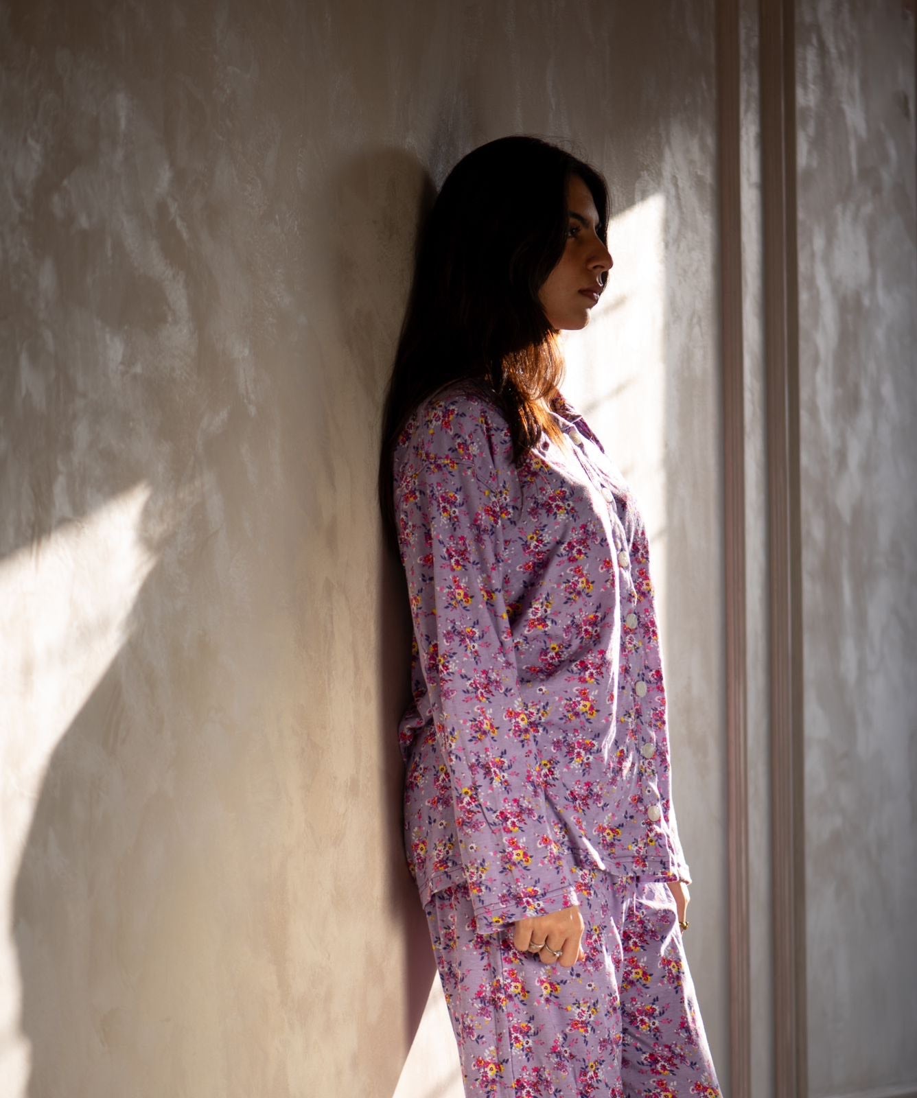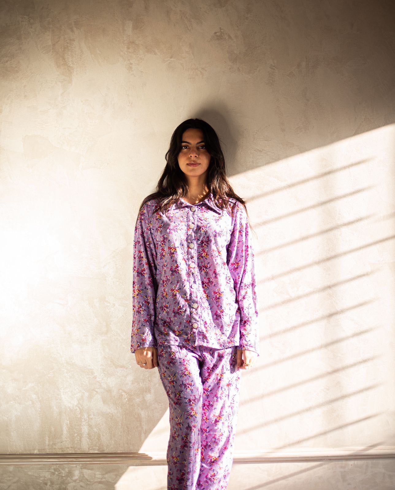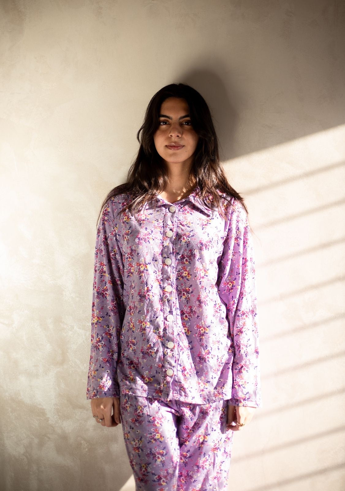 Introducing the Lila Purple Floral Printed Button-Down Lounge Set. This beautiful set features a soft collar and a stunning purple floral print, crafted from soft combed cotton jersey for premium comfort. Perfect for lounging or casual wear, it offers both style and relaxation.